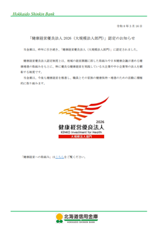 北海道信用金庫 「健康経営優良法人2026(大規模法人部門)」認定のお知らせ