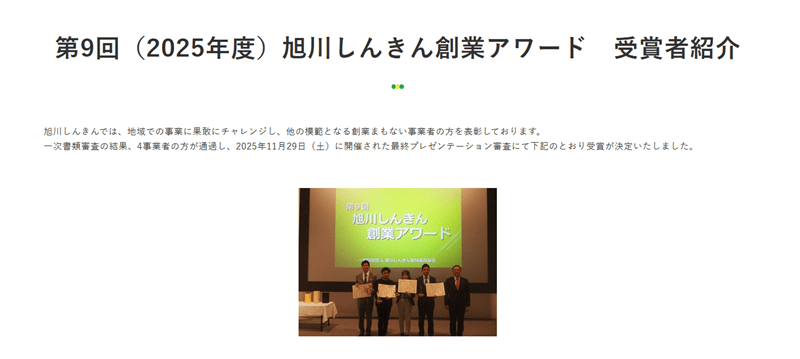 旭川信用金庫 第9回(2025年度)旭川しんきん創業アワード 受賞者紹介